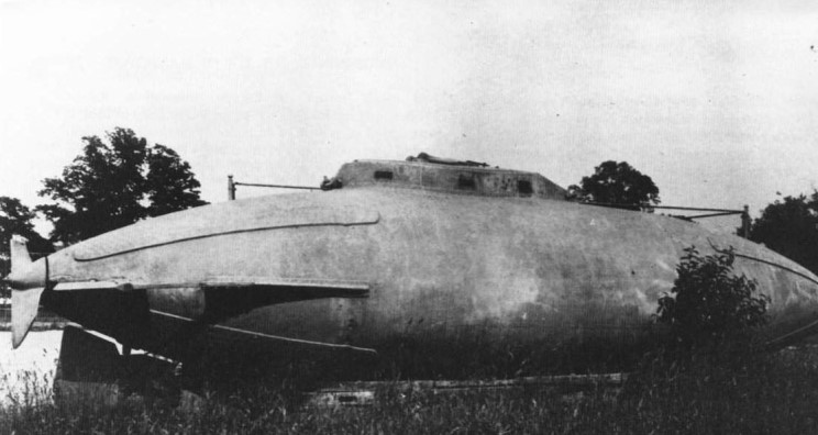 When finished the little submarine was 14' long and weighed 2 1/2 tons and was fitted with a gas powered