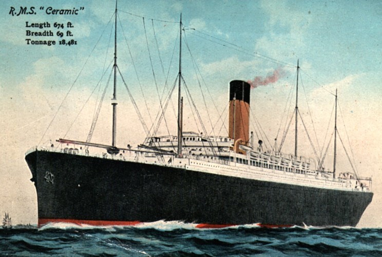 Dec. 11, 1912 the White Star liner Ceramic was launched at Harland & Wolff in Belfast, Ireland. Ceramic served in both world wars as a troopship. Tragically she was sunk 5 days short of her 30th year in the water on Dec. 7, 1942 when the U-515 torpedoed her near the Azores. The appalling loss of life included many members of the Queen Alexandra's Imperial Military Nursing Service and 133 passengers, including 12 children. Only Sapper Eric Munday of the Royal Engineers survived having been picked up by the U-515, he spent the rest of the war as a POW in Italy. In total six hundred and fifty-six souls were lost. |