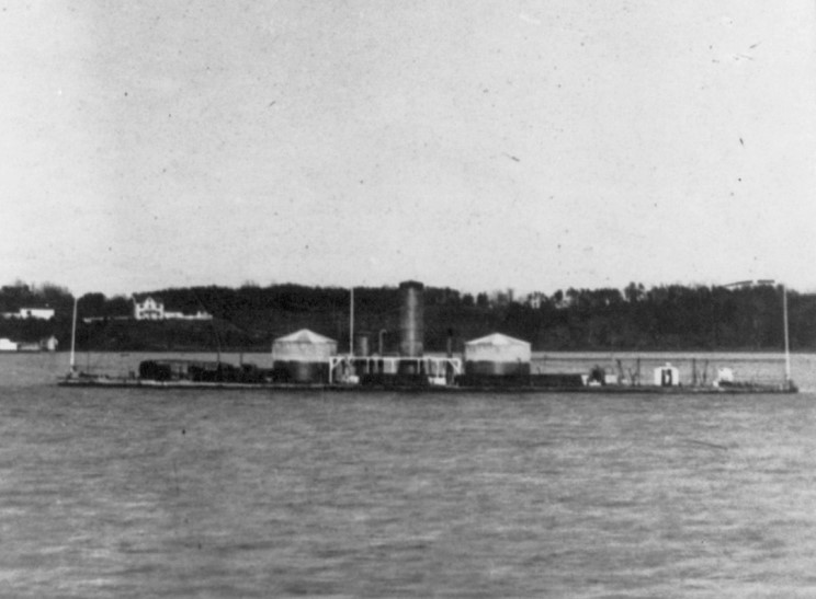 The first USS Miantonomah seen during the American Civil War. This Miantonomah was a wooden hull twin turret monitor and was taken to John Roach & Sons to be rebuilt in 1872. |