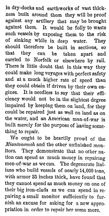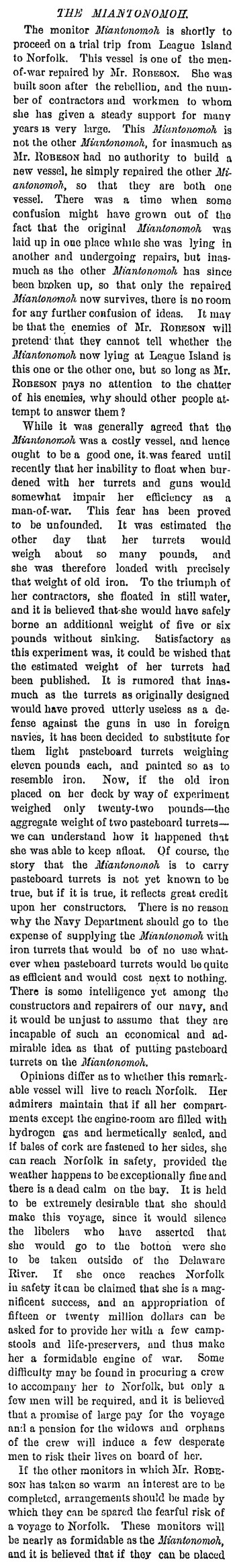 December 5, 1876 the monitor Miantonomah was launched at John Roach & Son in Chester, Pennsylvania. The construction of Miantonomah and her sisters caused a national scandal when it was learned that Secretary of the Navy George Robeson had circumvented the congress by claiming that the ships were being rebuilt when in fact the ships were new builds from the keel up, and congress had not authorized the construction of new ships. It took several years before she was ready to join the navy and in 1882 a columnist from the New York Times wrote several very snarky editorials aimed at Robeson, about the upcoming voyage of the Miantonomah from League Island to Norfolk. The below editorial was published Nov. 25, 1882 and despite the opinion, Miantonomah continued in service to the U.S. Navy until 1915, she was scrapped in 1921.