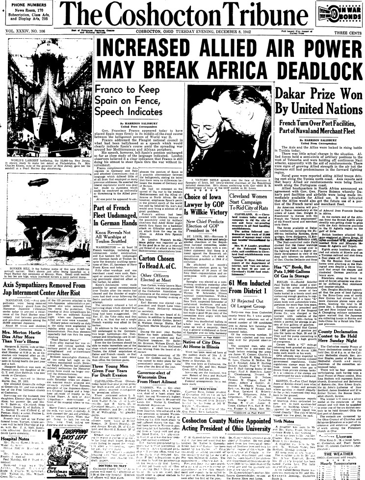 December 8, 1942: Front page of the Coshocton Tribune, Coshocton, Ohio announcing the launch of New Jersey.