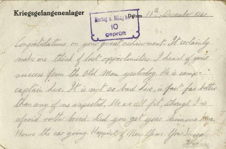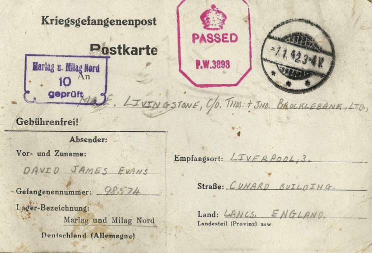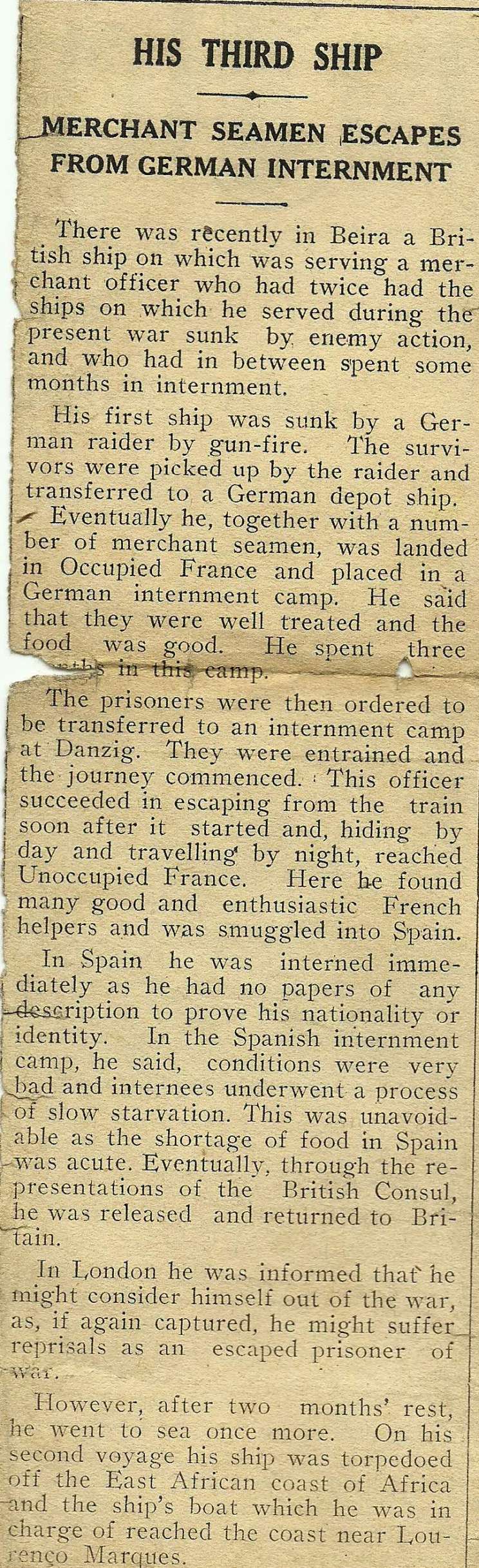 I read with interest the above daily update, which I would like to express my thanks for you posting. I believe my late father, Edward S. Livingston, was one of the officers that served on this ship, I am currently trying to verify this and awaiting a copy of 'Voyage 62', which I will hope might tidy up some loose ends. As a point of interest, my father escaped internment from a train while being transported to Marlag from occupied France. He subsequently worked his way through unoccupied France and on to Spain where he was interred again before being repatriated and returning to the merchant service. I have attached a newspaper article (sadly incomplete) and post card (seen below) from a fellow seaman congratulating him on his success which I thought might be of some interest to you. Anecdotally, he claimed to be have been the one responsible for damaging the seaplane by gun fire. He also received a bullet wound in the lower leg as result of the attack. If you might have a crew list for this event, I would be very grateful if you might be able to share this. I hope this information might be of some interest to you. Sincerely, Ed Livingston |