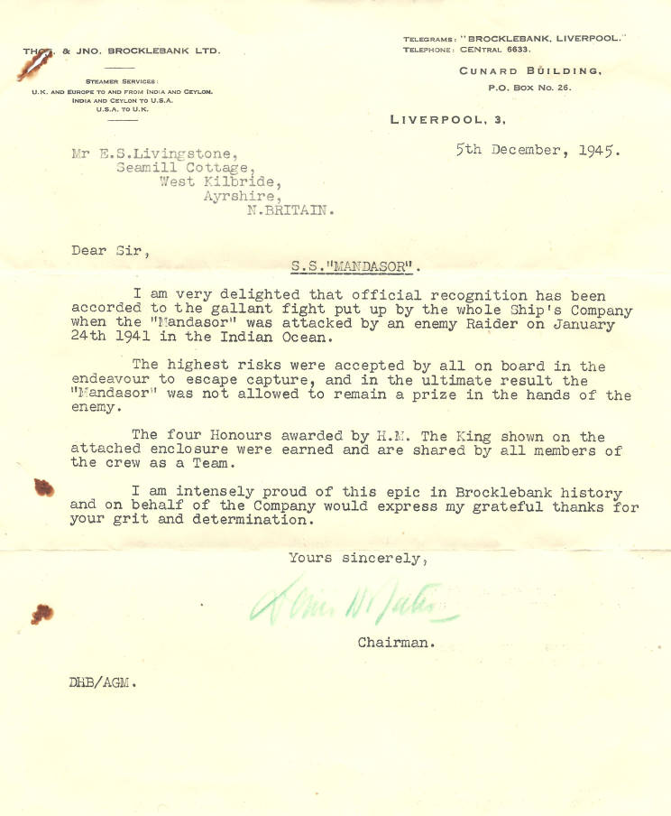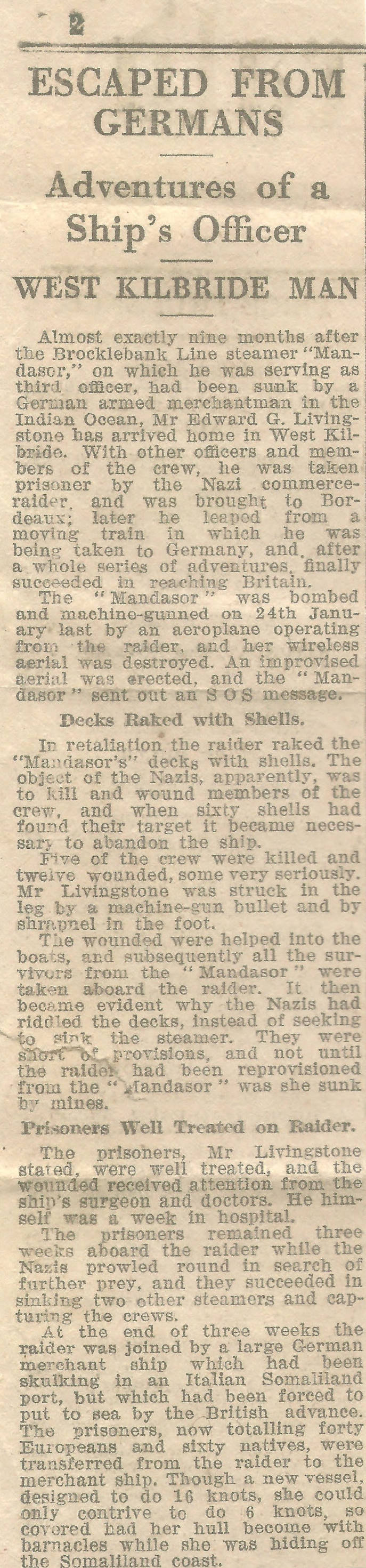 Mar. 24, 2011 Since my previous e-mail, I have received a copy of 'Voyage 62' and can now confirm that my father was the Third Officer on the Mandassor. It would appear he was on watch at the time of the initial seaplane attack. He raised the alarm, opened fire on the aircraft from the bridge and received a bullet wound in the ankle. The book goes on to reaffirm the details I submitted previously regarding the subsequent escape from internment. Ed Livingston |