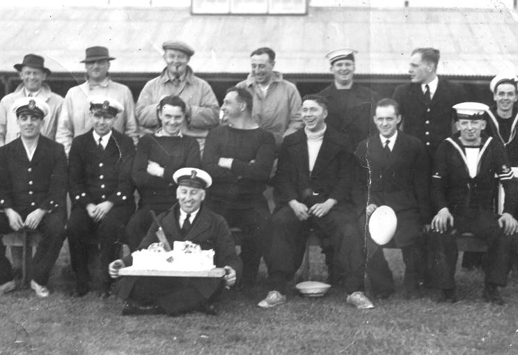 Several officers and men of HMS Undaunted along with some civilians, date unknown. Able Seaman James T. Beatty (late of Undaunted) is seen front row, third from right. |