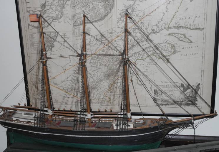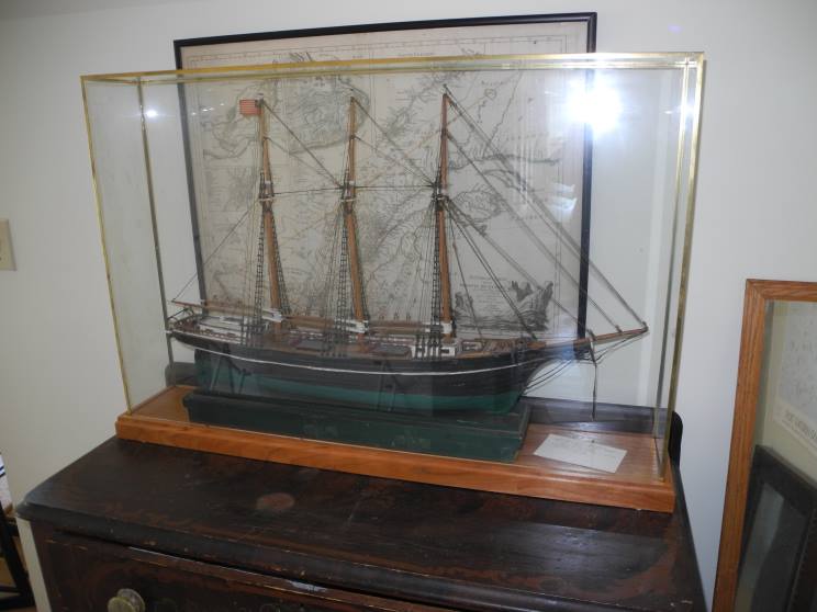 Apr. 18, 2017 I encountered your fine website MaritimeQuest while looking for online references to the T.B. Witherspoon, an American commercial schooner that went down in a gale off Nantucket in January, 1886. It was the subject of your own "Daily Event for January 11, 2102." I have a model of the T.B.W., (showing above) very nice work, about a yard long, that has been in my family a long time, possibly since the 1880's. I found it in my great-grandparents' home in Burlington, Vermont in 1993 when I was preparing that home for sale, and I suspect it had come three doors down from the home where my great-great-grandfather U.S. Army general Oliver Otis Howard lived in his retirement until his death in 1909. OOH grew up in Leeds, Maine in the 1840's and I guess maybe some old friend of his from home or from the service might have been an owner of the TBW. The model has been in my mother's seasonal home in Maine since I found it a quarter century ago and with that home going up for sale, we are thinking of selling the model. It also has a fine glass case on a wood base (showing below) made perhaps 20 years ago. It is in very good condition, a little dusty, but the only damage I can think of is that the very tip of the bowsprit is snapped off and dangles from its stays. It would be easy to reattach it. Keep up the good work, your website is wonderful! David Hammond |