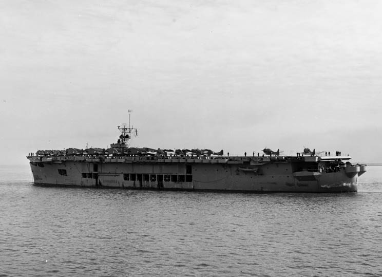 Even if there is no enemy action aircraft operations on carriers is a dangerous business for pilots and ship's crews. There are many examples of casualties caused during take-off and landing operations and such was the case on January 25, 1944 aboard USS Sangamon CVE-26. The carrier was en route from Pearl Harbor to Kwajalein to support the U.S. invasion of the Marshall Islands and was conducting normal aircraft patrols. At 1651 hrs. an F6-F Hellcat of VF-37 attempted a landing and missed the hook. The aircraft went through the crash barrier and the external fuel tank broke loose and skidded across the deck into a group of aircraft. The tank exploded and sprayed burning fuel across the forward part of the flight deck and set several of the planes afire. The fires were contained in less than ten minutes, but the damage had been done. Fifteen men had jumped overboard to avoid the flames, two of them were never seen again. Another nine men, including the pilot, died or died of injuries later. The crew made the necessary repairs to keep her in fighting order and she was on station to support the landings at Kwajalein and days later at Eniwetok before returning to Pearl for permanent repairs. |
