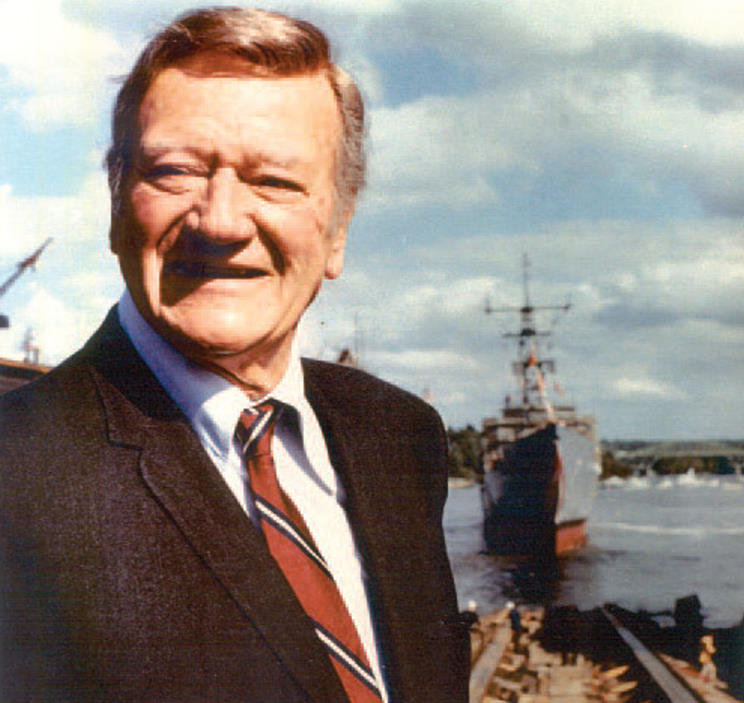 The launch of a new class of frigate took place on September 25, 1976 at Bath Iron Works in Bath, Maine. The Oliver Hazard Perry FFG-7 was the first ship of her class and the first ship built for the U.S. Navy at BIW for seven years. The event was attended by about 10,000 people and when the moment of truth came... The keynote speaker was Secretary of Defense Donald Rumsfeld who made the case for passage of a new defense bill that was in Congress. The purely political speech contained nothing of note that would be worth reprinting here, but he did what he could to secure funding for the military before what turned out to be the disastrous presidency of Jimmy Carter which would plunge the nation into a deep recession and end with Americans being held hostage in Iran. However future events were not on anyone's mind at BIW, the first concern was to get their new ship into the water. After the speeches Mrs. Morgan Hebard, the great-great granddaughter of Commodore Perry broke the bottle of champaign across the bows. With great excitement the crowd watched, but the ship did not move. There are several versions of what happened next, which one is exactly true will never be known. One of the guests at the podium stood up, approached the ship and gave her a shove, after which she began to move and the launch was a success. Some say this happened just as the last of the blocks was removed, another account claims the guest looked over at the men working to free the stuck ship, and on a cue from one of the men he placed his hand on the ship and she went down the ways. There are still other variations on the story, but one thing is for sure true. The guest did appear to shove the ship and the ship did slide down the ways, the other details will always be in dispute, but it made a great show. The Oliver Hazard Perry class would become one of the most prolific classes of warships ever built, there were seventy-five built for four navies (United States, Australia, Spain and Taiwan). Many are still serving in the aforementioned navies as well as Poland, Turkey, Egypt and Bahrain, the last one was launched on Oct. 17, 2002. Bath Iron Works built twenty-four of them, but none of them had such an interesting launch. The guest...well one would need a legend to create a legend and in Bath, Maine that day a legend was present. You might know him as Big Jake or even Rooster Cogburn, yes it was "The Duke", that's right, John Wayne. |