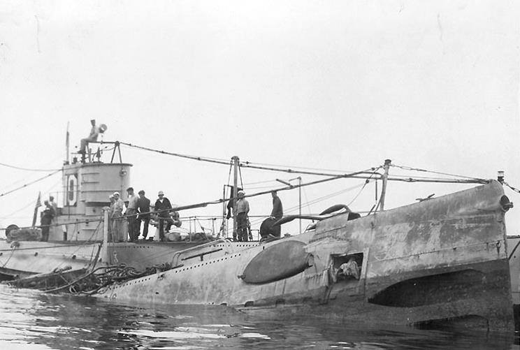 Oct. 13, 1921: USS R-6 SS-83 being raised by USS R-10 SS-87 (seen) and USS Cardinal AM-6. The bows of R-6 have just broken the surface. |