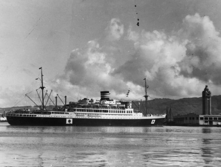 Nitta Maru seen at Honolulu, Hawaii. The Aloha tower is seen in the background. |