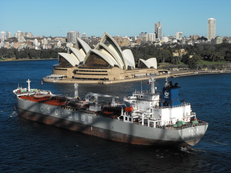 July 2, 2009: CSC Cyanite seen from the Harbour Bridge passing the Sydney Opera House departing Sydney, Australia. |