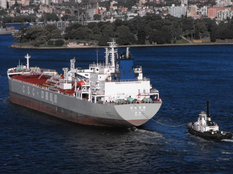July 2, 2009: CSC Cyanite with the tug Watagan seen from the Harbour Bridge departing Sydney, Australia. |