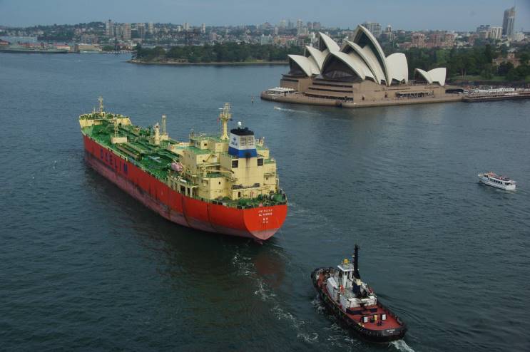 October 29, 2011: DL Cosmos seen from the Harbour Bridge departing Sydney, Australia. The tug Watagan is seen astern and the Sydney Opera House is seen in the background. |