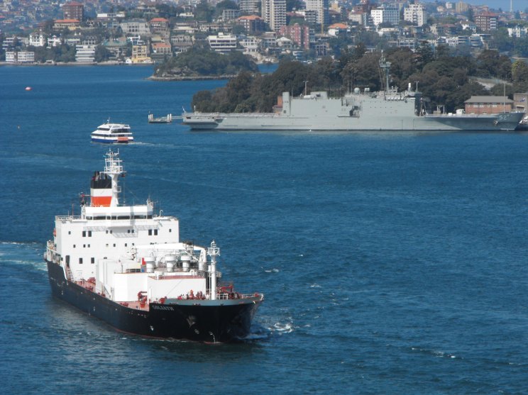 September 21, 2010: Goliath seen passing Garden Island under escort of the tug Woona (hidden behind the stern). HMAS Manoora L-52 is seen at Garden Island in the background. |