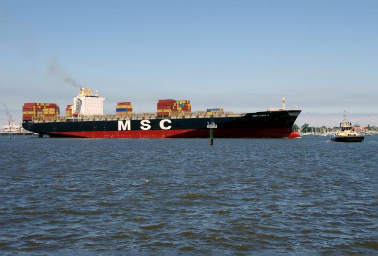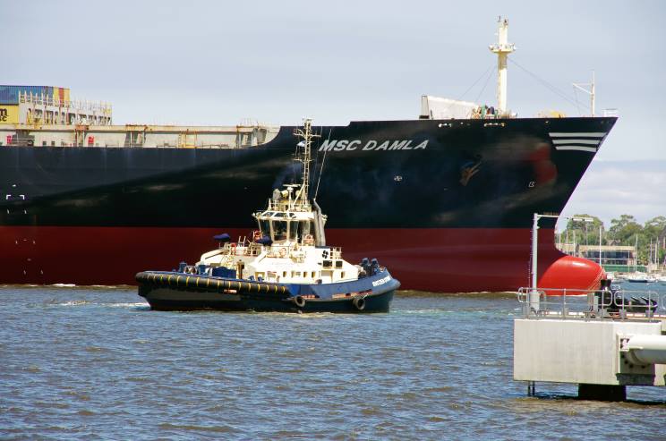 February 7, 2017: MSC Damla seen arriving at the mouth of the Yarra river, Victoria, Australia. The tug Svitzer Otway is seen at right. |