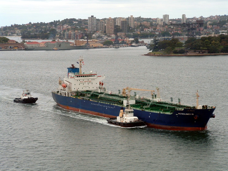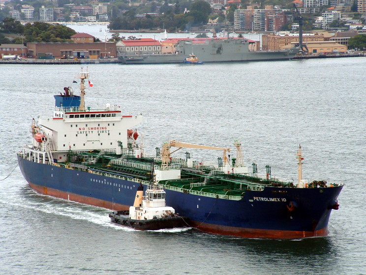 November 26, 2008: Petrolimex 10 arriving at Sydney, Australia, HMAS Manoora L-52 is seen moored at Garden Island in the background. |