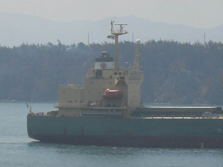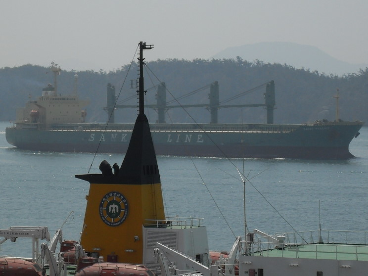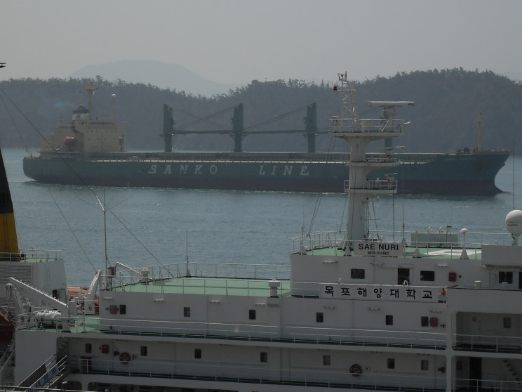 April 6, 2009: The Sanko Phoenix seen passing the Mokpo Maritime Univirsity in Mokpo, Republic of Korea. The training ship Sae Nuri is seen in the foreground. |