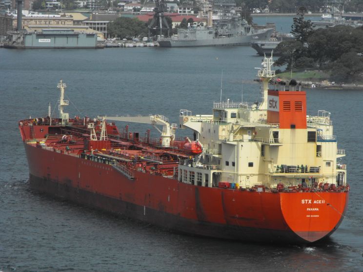 January 13, 2011: STX Ace 11 seen departing Sydney, Australia. HMAS Newcastle FFG-06 is seen at Garden Island in the background. |