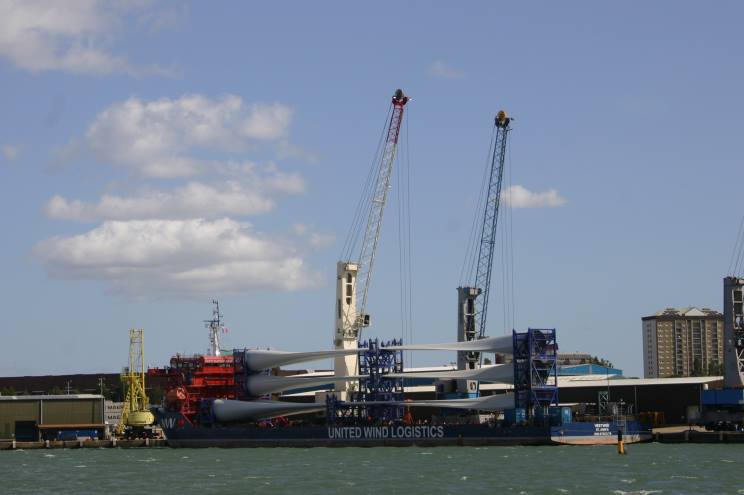 September 4, 2019: Vestvind seen with a cargo of wind turbine blades at Portsmouth, England. |