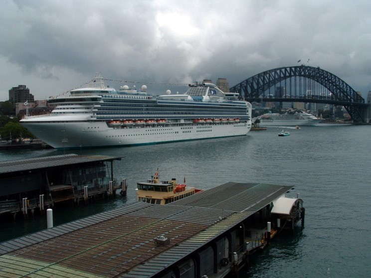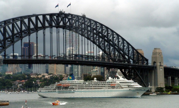 February 2, 2008: Amadea passing under the Harbour Bridge in Sydney, Australia. The Sapphire Princess is moored at the Circular Quay in the foreground. |