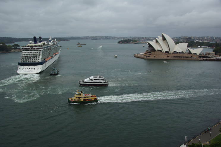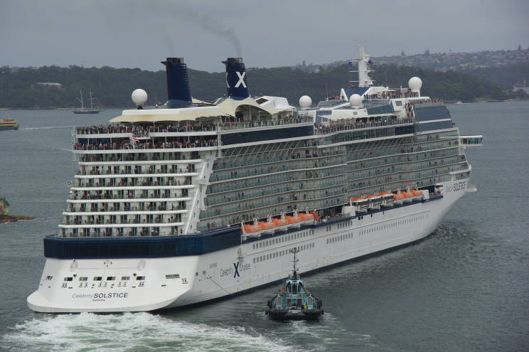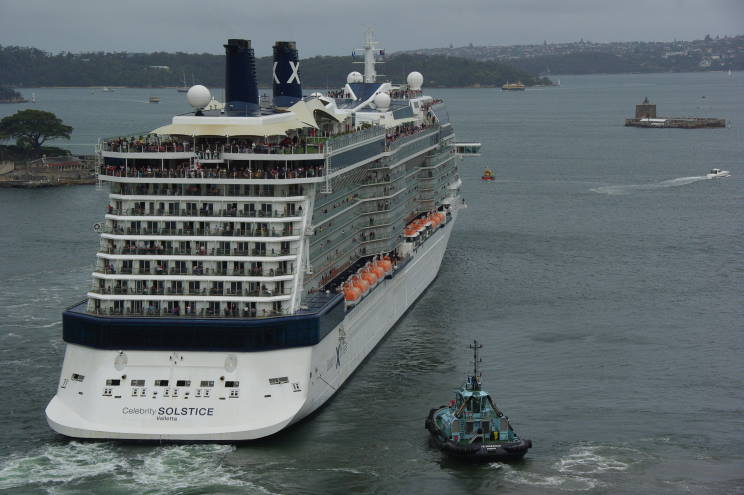 December 11, 2012: Celebrity Solstice seen getting underway at Sydney, NSW, Australia. The tug PB Endeavour is seen astern. |