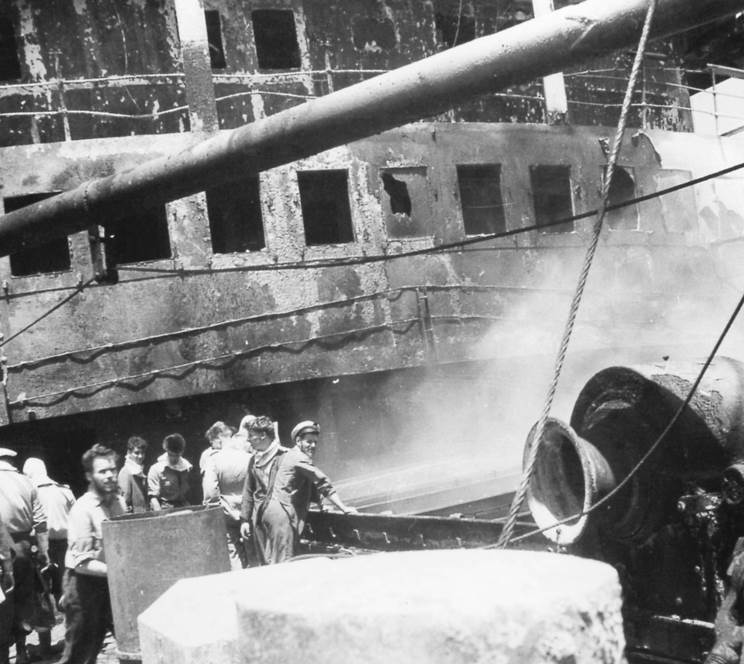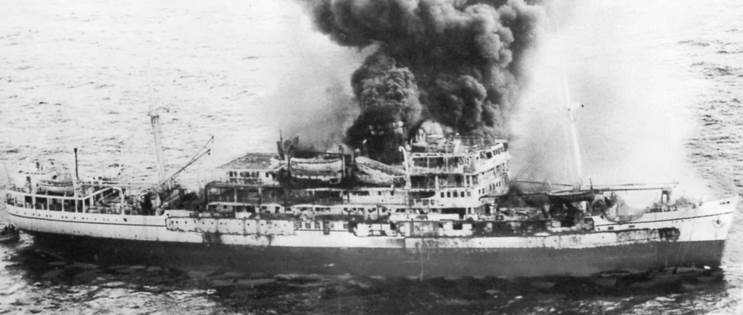 April 1961: Crewmen seen on board the burning Dara. |