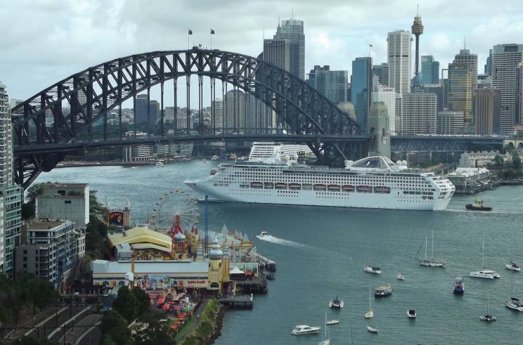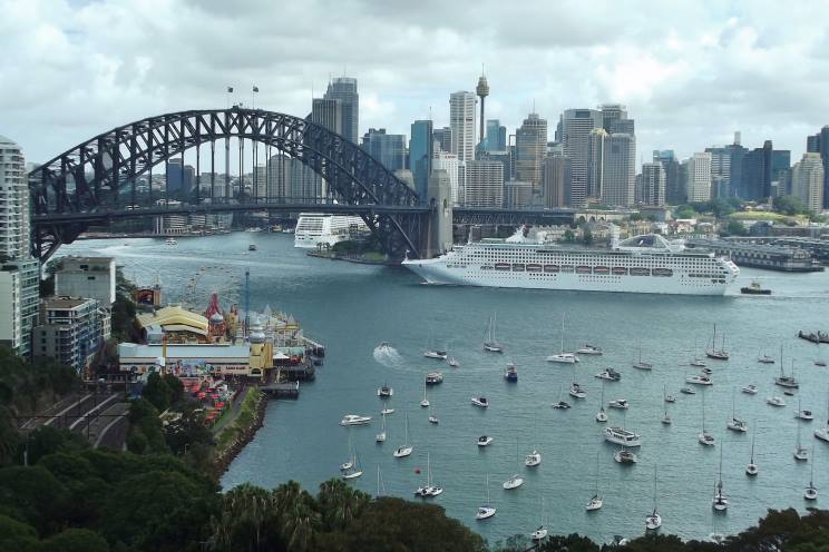 January 3, 2017: Dawn Princess about to pass under the Harbour Bridge, Sydney, NSW, Australia. Explorer of the Seas can be seen berthed at the