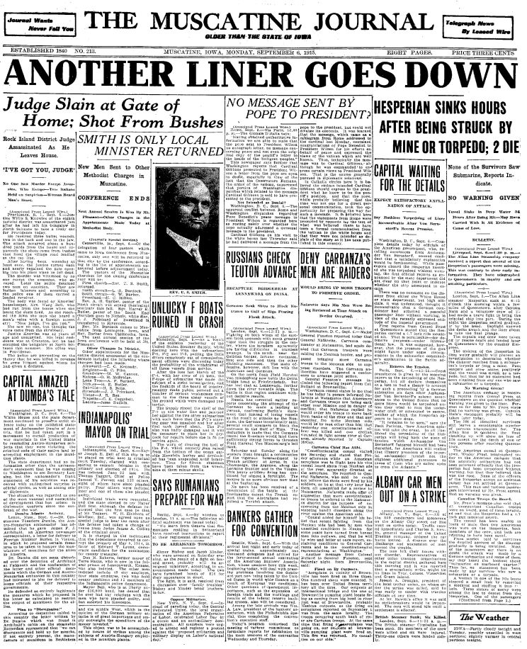 September 6, 1915: Front page of the Muscatine Journal, Muscatine, Iowa. |