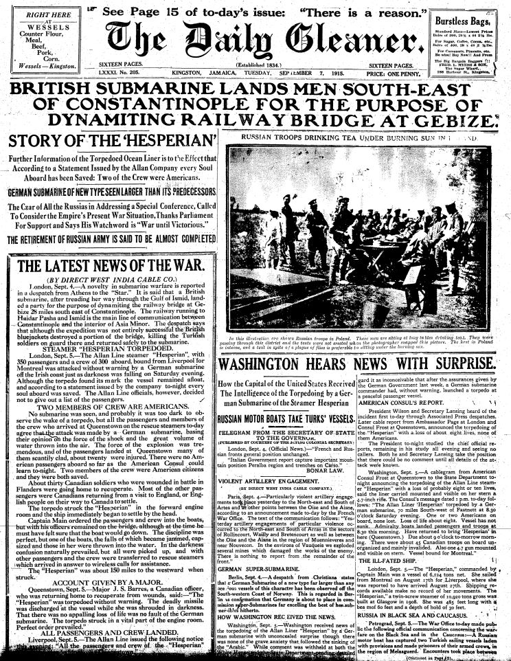 September 7, 1915: Front Page of the Daily Gleaner, Kingston, Jamaica. |