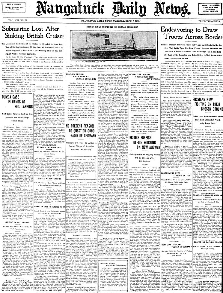 September 7, 1915: Front page of the Naugatuck Daily News, Naugatuck, Connecticut. |