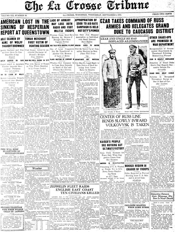 September 8, 1915: Front page of the La Crosse Tribune, La Crosse, Wisconsin. |