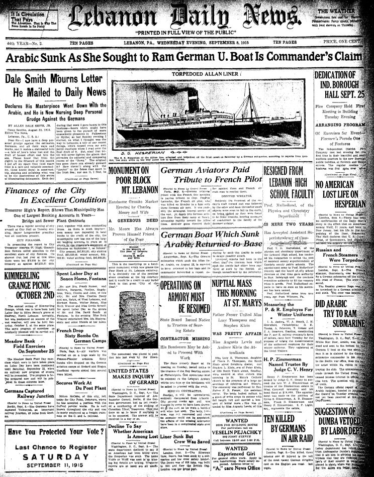 September 8, 1915: Front page of the Lebanon Daily News, Lebanon, Pennsylvania. |