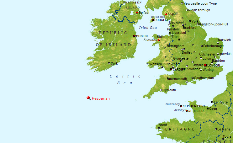 Location of the loss of Hesperian (50.03N - 10.10W).