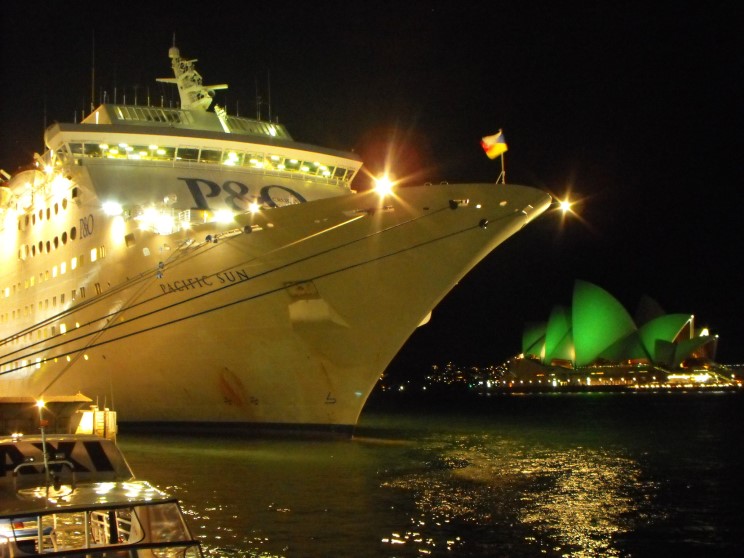 March 17, 2010: Pacific Sun at the Circular Quay, Sydney, Australia. The Sydney Opera House, light up for St. Patrick's Day is seen in the background. |