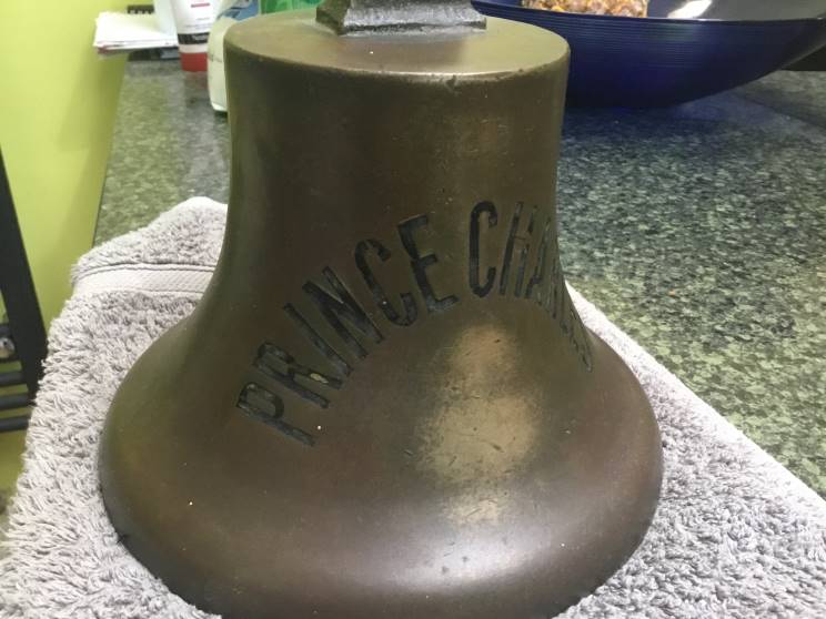 2. June 11, 2020 In 1961/2 my father purchased the ship's bell belonging to, the then recently decommissioned, SS Prince Charles. He bought the bell from a Belgian antique dealer in Totnes, Devon. My father understood the owner regularly visited his homeland to purchase stock. I can only assume the owner lived near the breakers at Willebroek. The bell is in excellent condition and has a wonderful and very loud tone. Interestingly I've just measured and weighed it. It's 8" tall, 8" wide and weighs 8 lbs. Kind regards, Virginia Warlow |