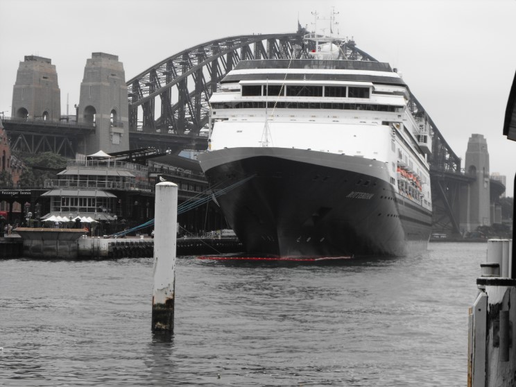 February 10, 2009: Rotterdam at the Circular Quay, Sydney, Australia. Note the flags on the Harbour Bridge are at half staff in respect for those who lost their lives in the wildfires in Victoria. |