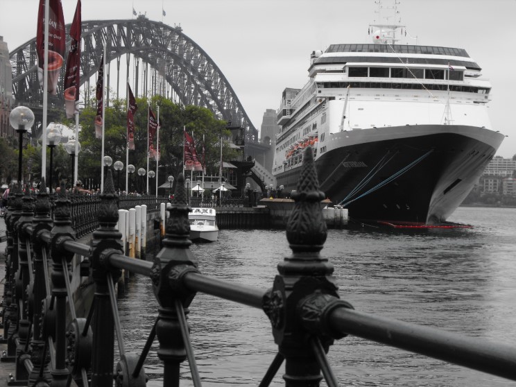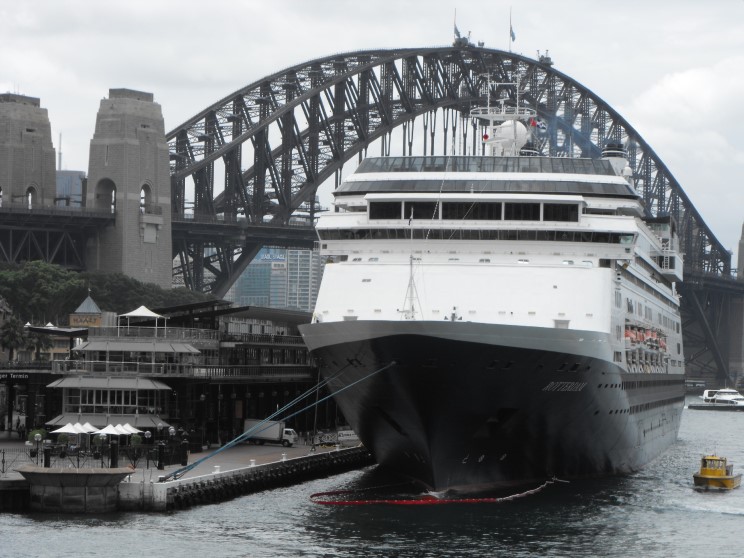 February 11, 2009: Rotterdam at the Circular Quay, Sydney, Australia. Note the flags on the Harbour Bridge are at half staff in respect for those who lost their lives in the wildfires in Victoria. |