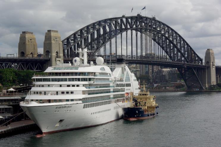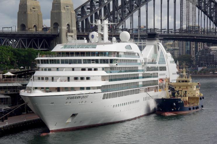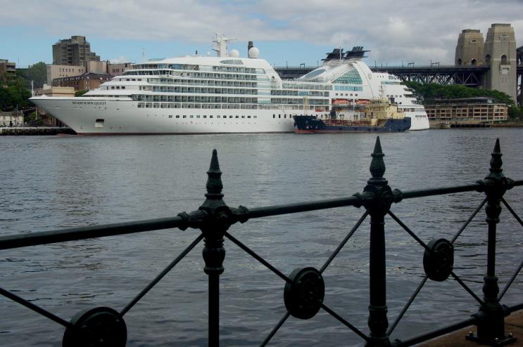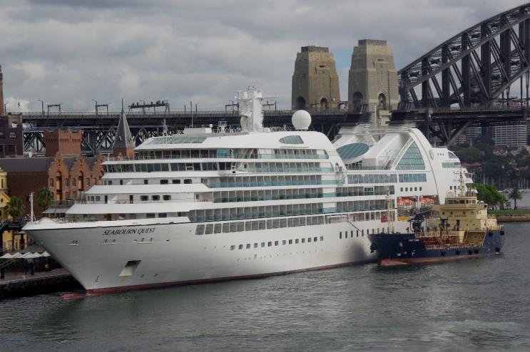 February 17, 2013: Seabourne Quest seen at the Circular Quay, Sydney, Australia. The service ship Anatoma is seen alongside. |