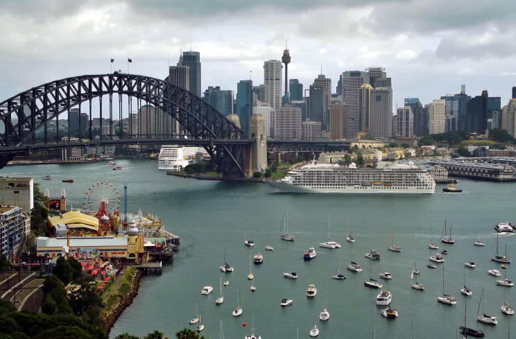 January 3, 2017: The World about to pass under the Harbour Bridge, Sydney, NSW, Australia. Explorer of the Seas can be seen berthed at the