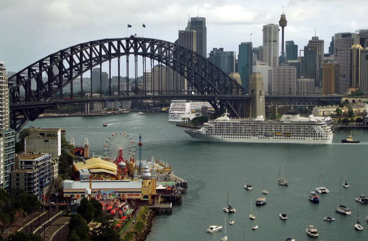 January 3, 2017: The World passing under the Harbour Bridge, Sydney, NSW, Australia. Explorer of the Seas can be seen berthed at the