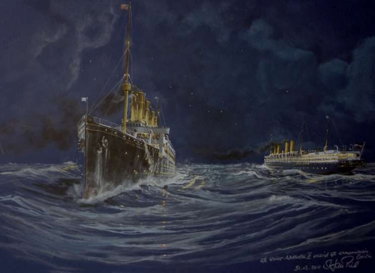 Portrait of Kaiser Wilhelm II passing Kronprinzessin Cecilie on a stormy North Atlantic by Stefan Piel. |