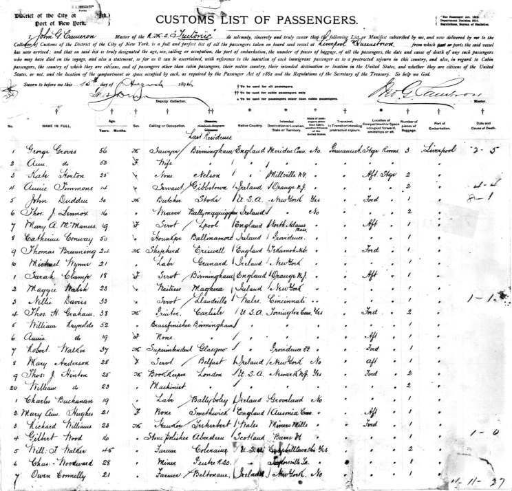 3. Aug. 20, 2011 I am attaching a copy of the ships Passenger Manifest, ca. 1894 for the HMS Teutonic. We believe a family member was aboard on this particular crossing to the USA (Passenger #228). Your website was immensely helpful in providing collateral information concerning the research of our forebears. A hearty thank you. Larry McCullough |