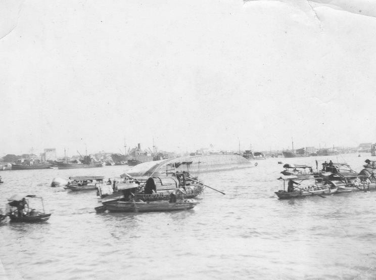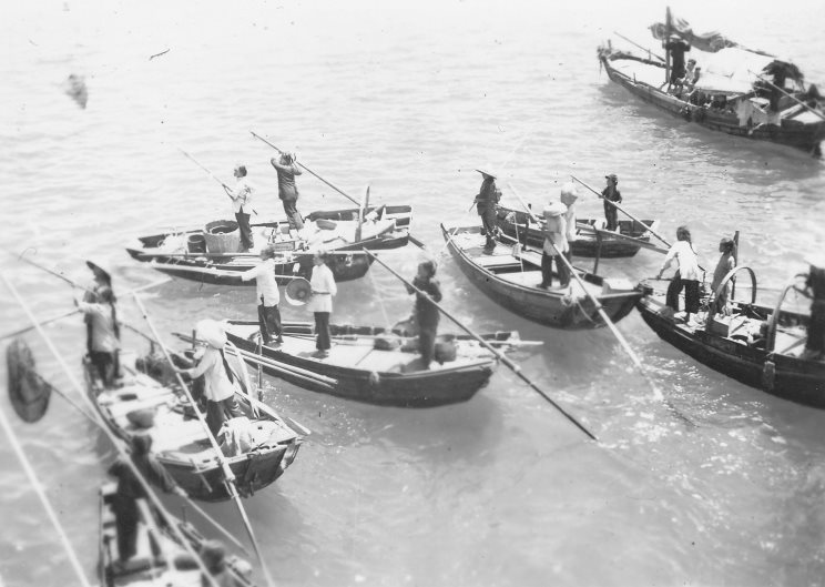 August 1945: Locals alongside HMS Euryalus in Hong Kong. |