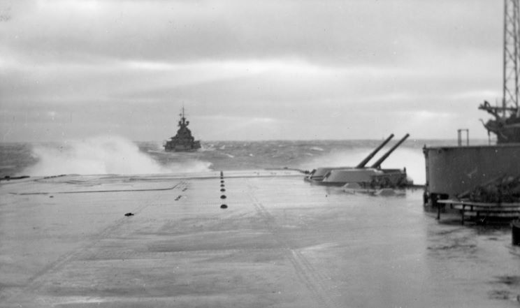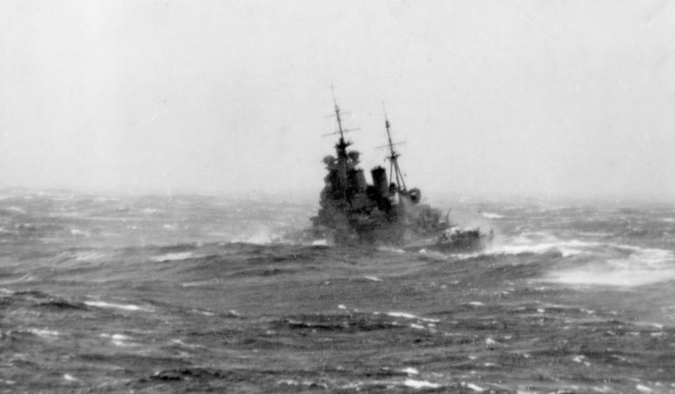 HMS King George V rolling in heavy seas seen from HMS Victorious. |