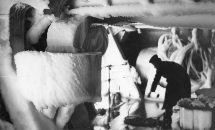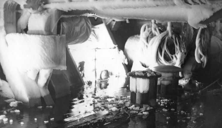 Ice build-up on one of the 4.5" turrets on HMS Victorious. |
