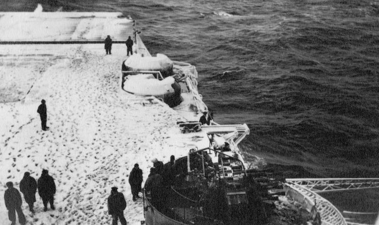 Crewmen shoveling ice off the flight deck of HMS Victorious. |