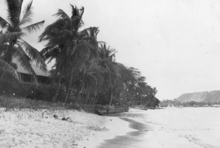 March 1943: Crewmen from HMS Victorious seen relaxing on Waikiki beach. The Royal Hawaiian Hotel is seen in the background. |