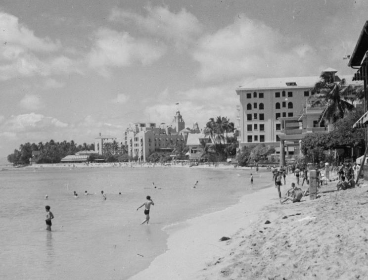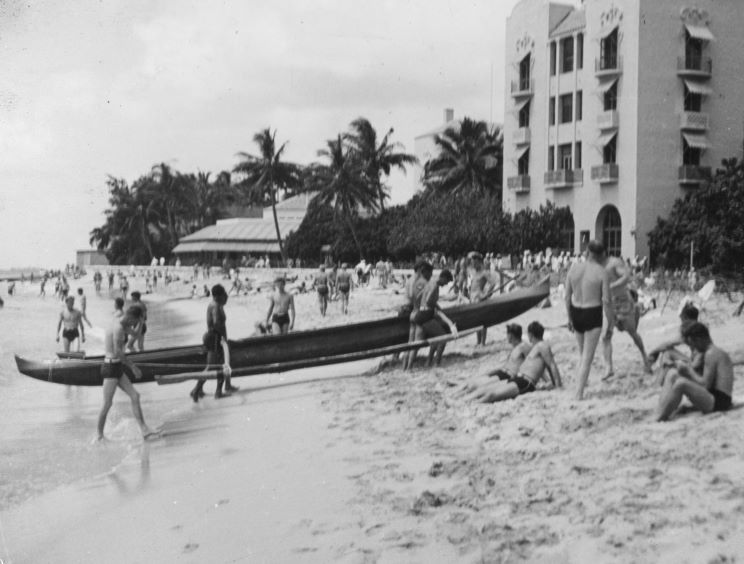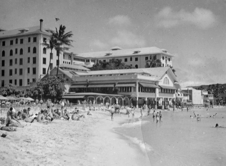 March 1943: Crewmen from HMS Victorious seen relaxing on Waikiki beach in front of the Royal Hawaiian Hotel. |