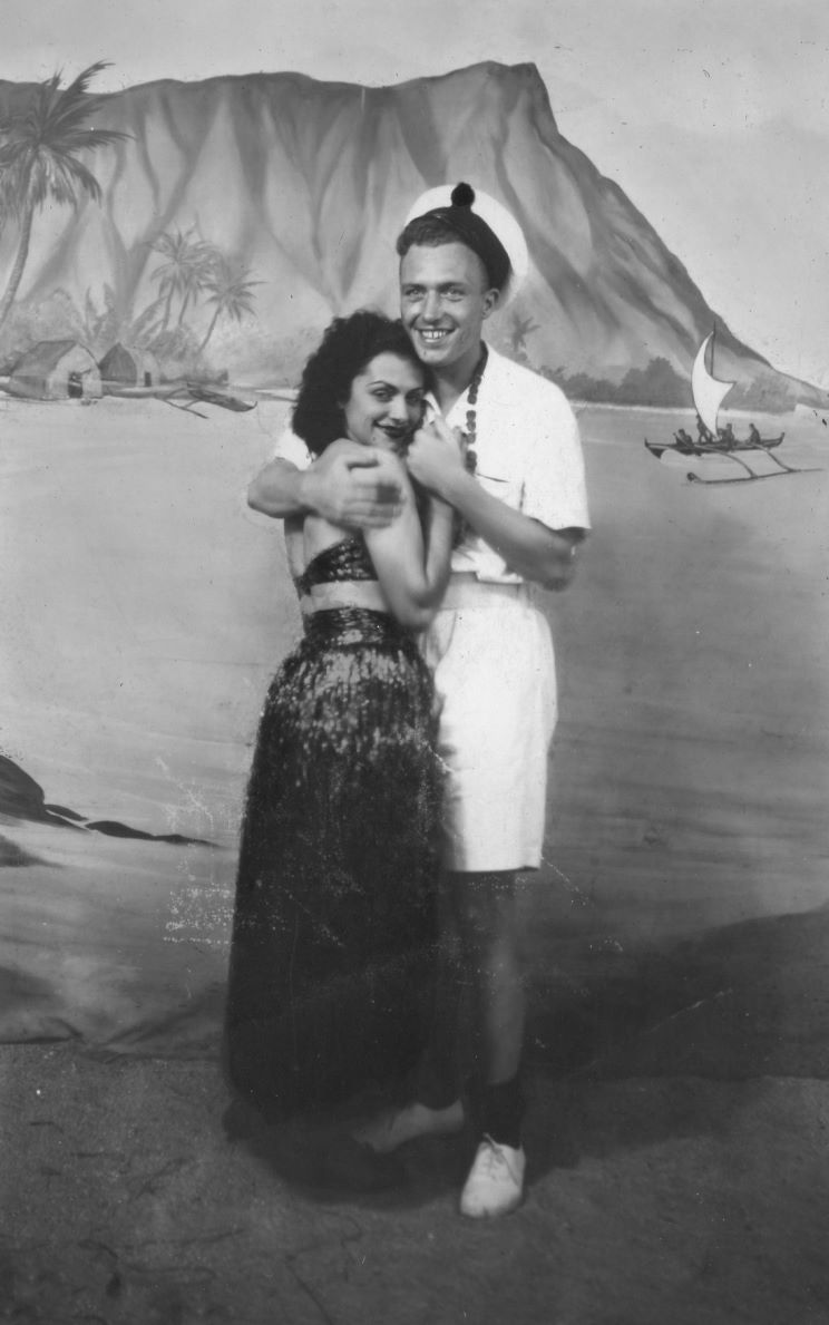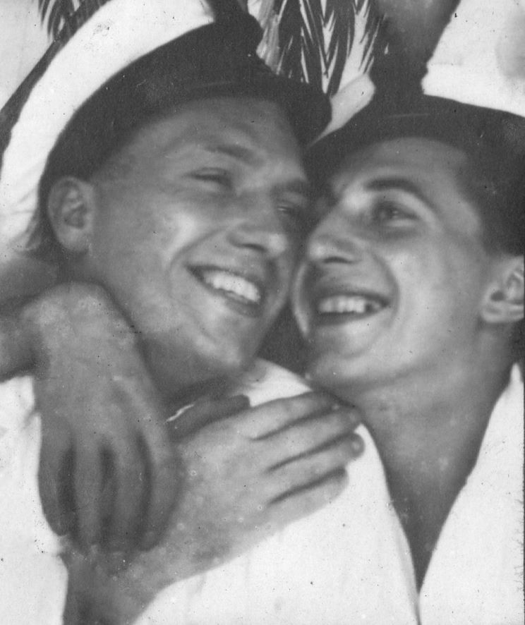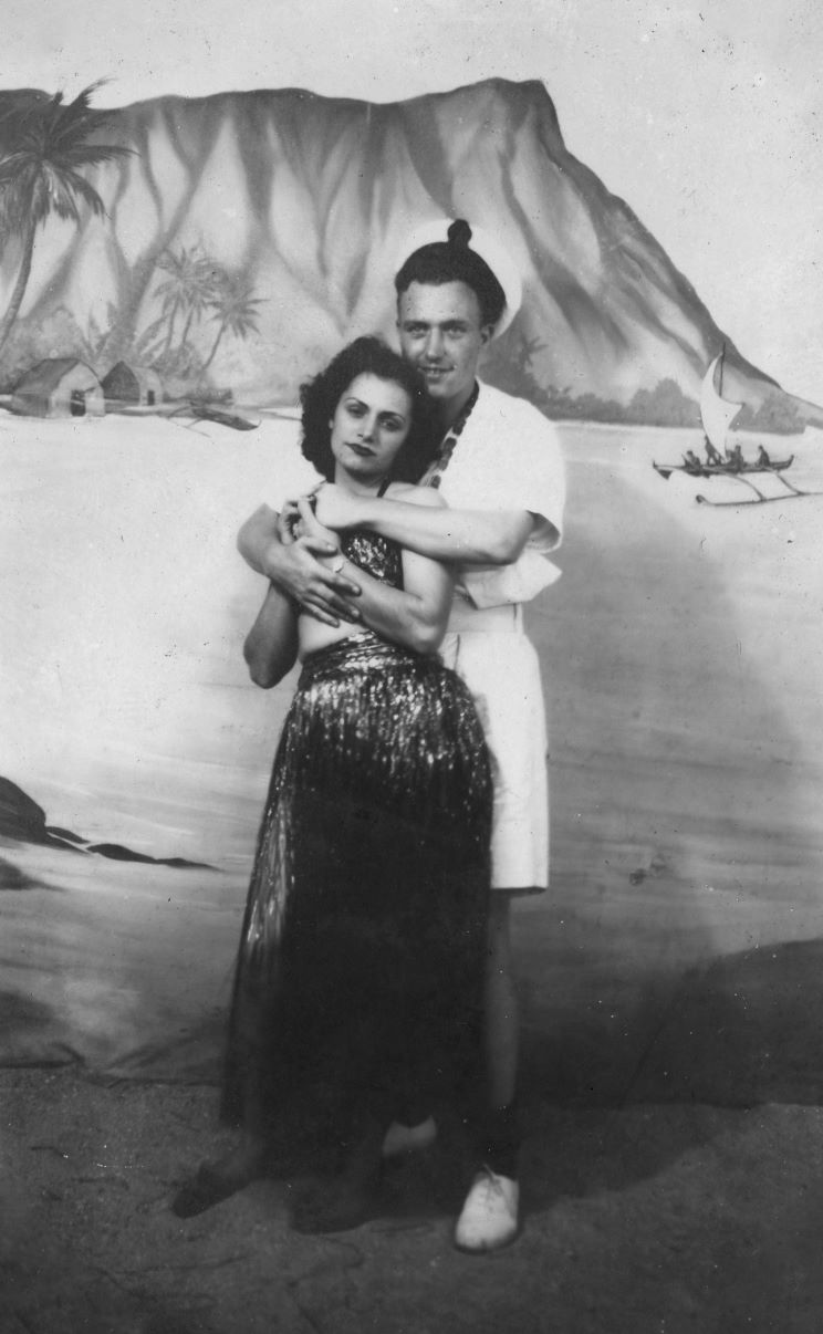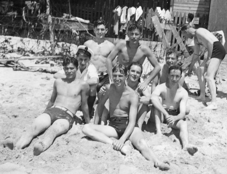 March 1943: Crewmen from HMS Victorious seen relaxing on Waikiki beach. George Wylam is seen in the back row at far right. |