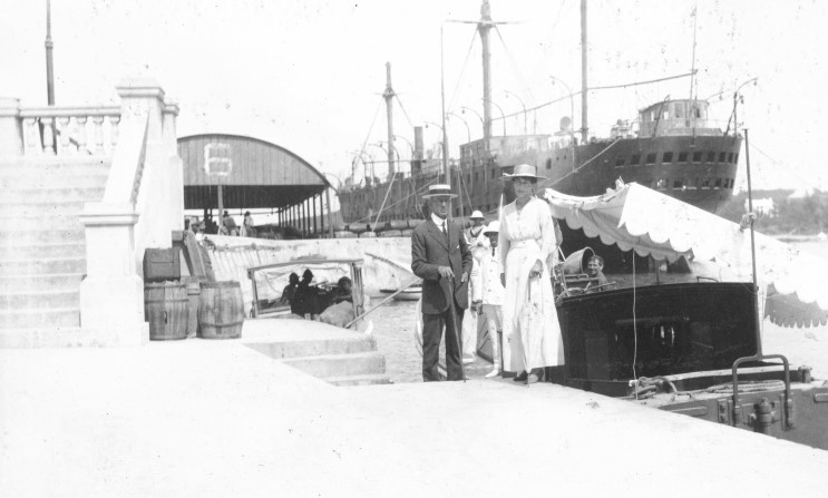 Admiral and Mrs. Morgan Singer. (HMT Malabar is seen in the background)