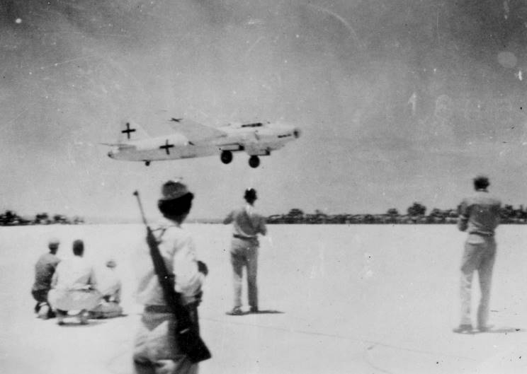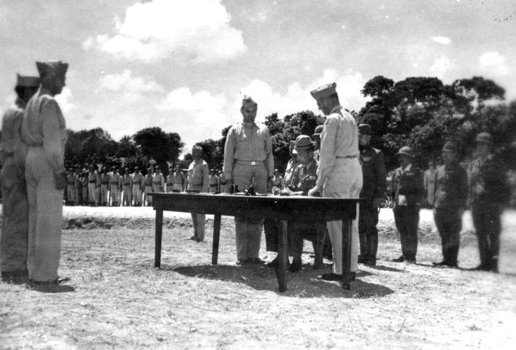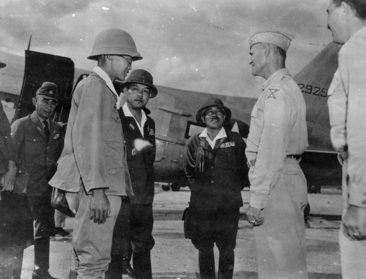 August 19, 1945: Japanese delegates stop over at Ie Shima en route to Manila to meet with General Douglas MacArthur to sign the surrender of the Philippines. |